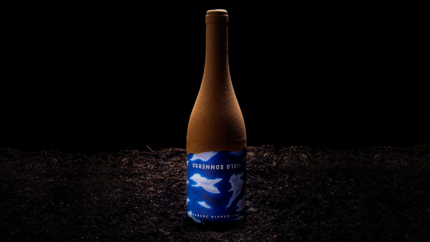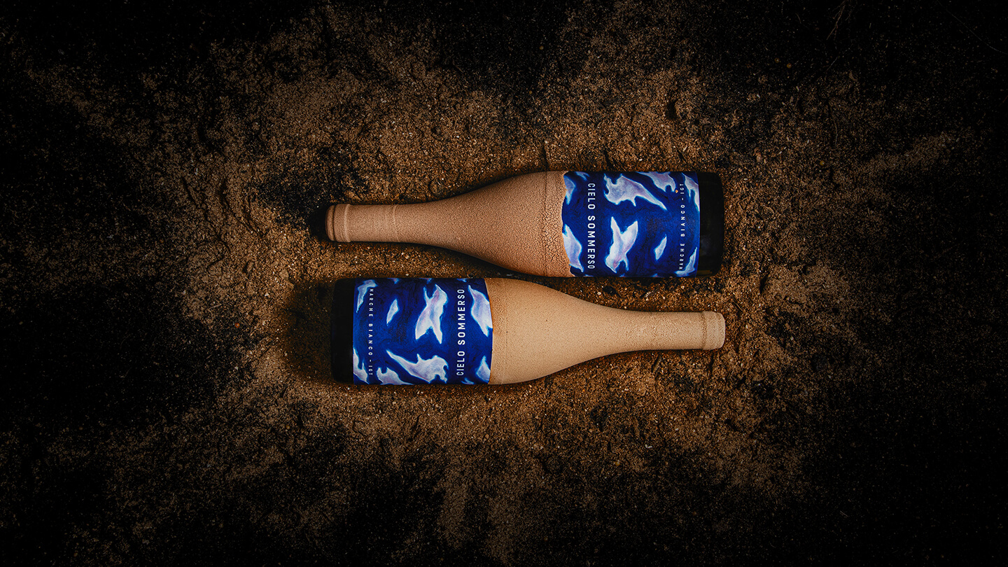 Cielo Sommerso(或淹没的天空)是隐匿在地下的被阳光浸泡的葡萄的隐喻。为了进一步表达这个想法,一位当地艺术家用丰富和鲜艳的色彩手绘了一个云景,然后将其用作标签。它旨在讲述葡萄酒酿造过程中令人难以置信