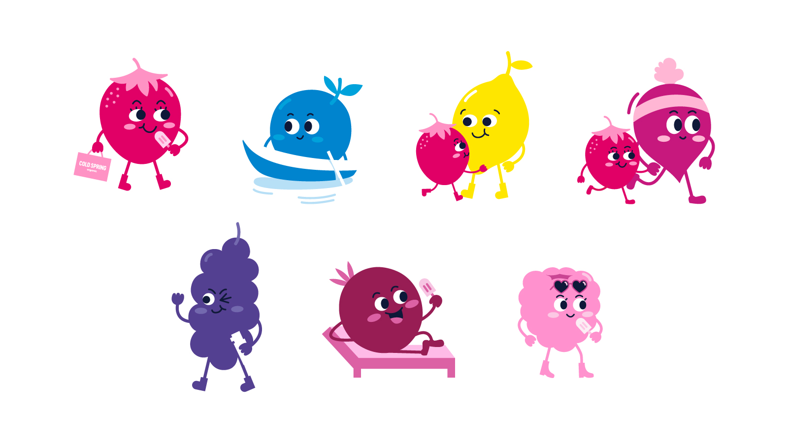 Cold Spring Organic 的角色由 7 种不同的水果组成:草莓、蓝莓、柠檬、桑椹、巴西莓、甜菜和覆盆子。这些字符象征着冷泉有机所使用的 100% 有机成分,代表了忠实于成分本质的产品。通过在有机产品中使用角色,每个人,无论年龄或性别,都能以友好、随意的方式享用产品。此外,朗朗上口的产品名称和表达方式更易于记忆和回忆。