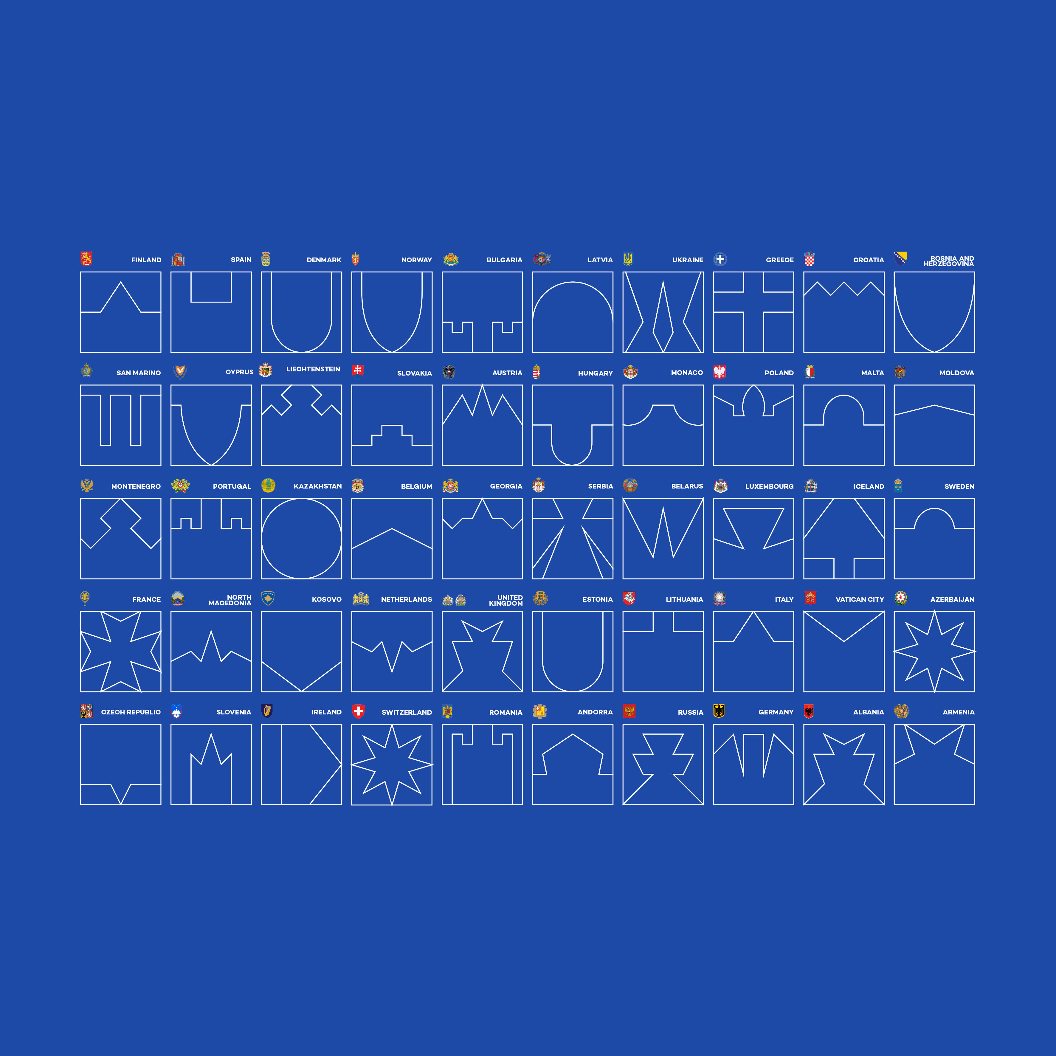 品牌设计项目,找到项目中所有国家的共同点非常重要。事实证明这很困难。起初,我们认为国旗是所有国家/地区都有的明显元素,但我们想要更具体的东西。我们找到了欧洲国家的纹章。我们知道这是获胜的概念。