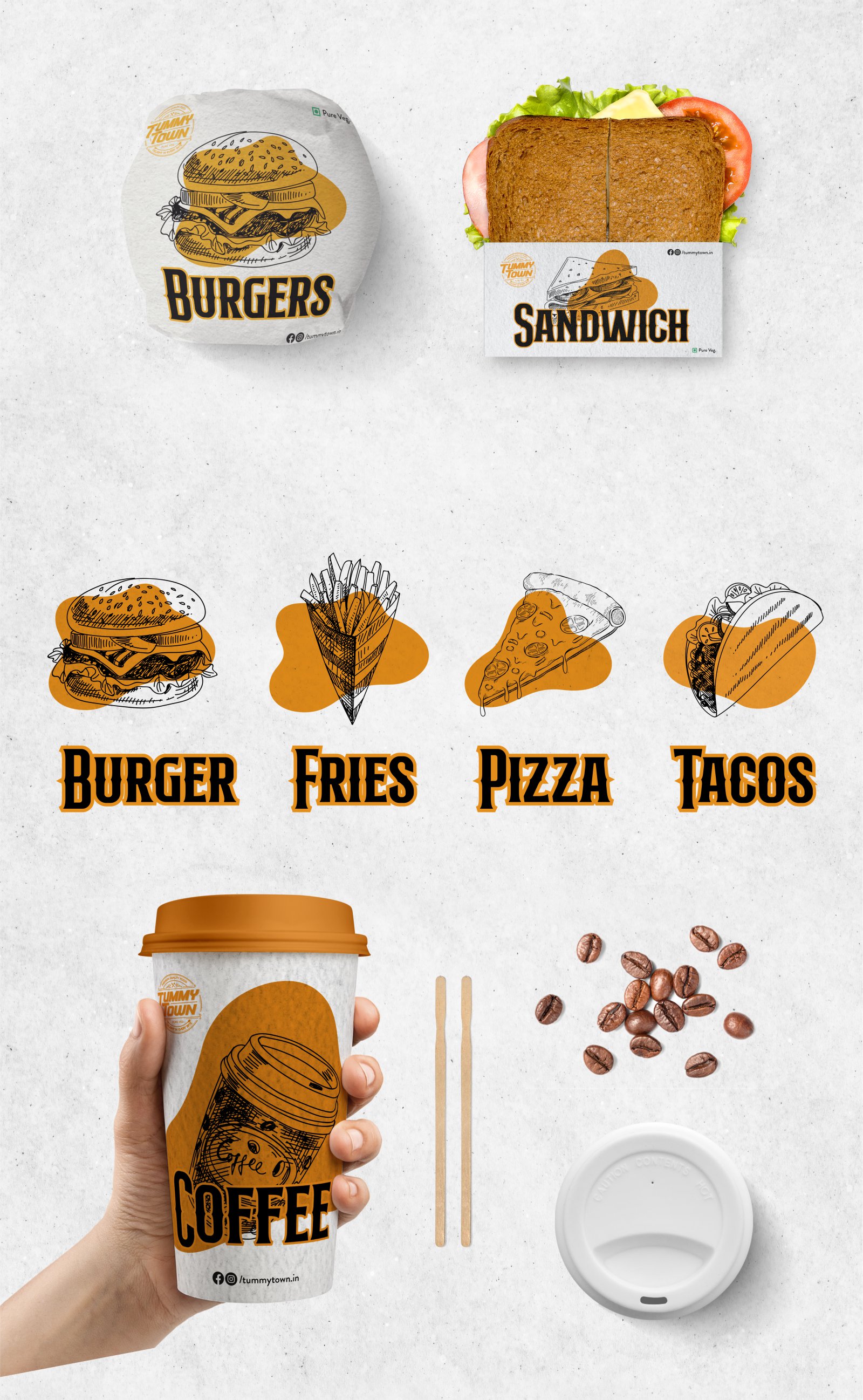 快餐店品牌形象设计。Tummy Town 最初从孟买开始,计划将这种经验带到印度各个城市,将非常传统的传统作为品牌元素。他们就品牌、商店设计和社交媒体创意与我们接洽。我们仔细分析了餐厅的概念、使命、愿景、它所迎合的人口统计数据和独特的价值主张。