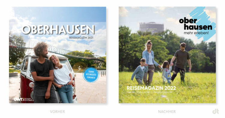 奥伯豪森的新品牌形象是与通讯机构 Contact (Oberhausen) 合作打造的。第一个使用新品牌设计的媒体已经出版,例如 Reisemagzin 2022。