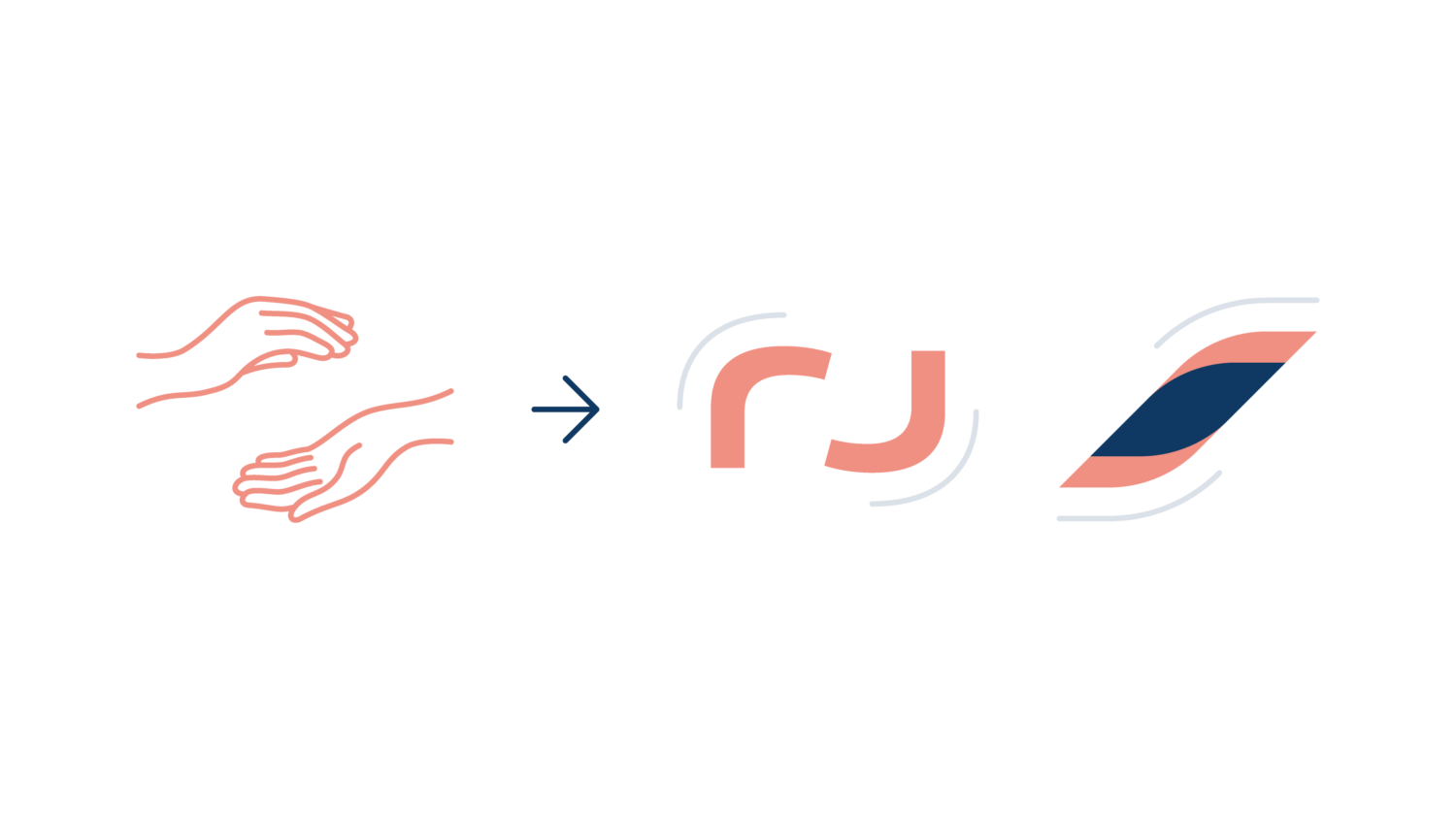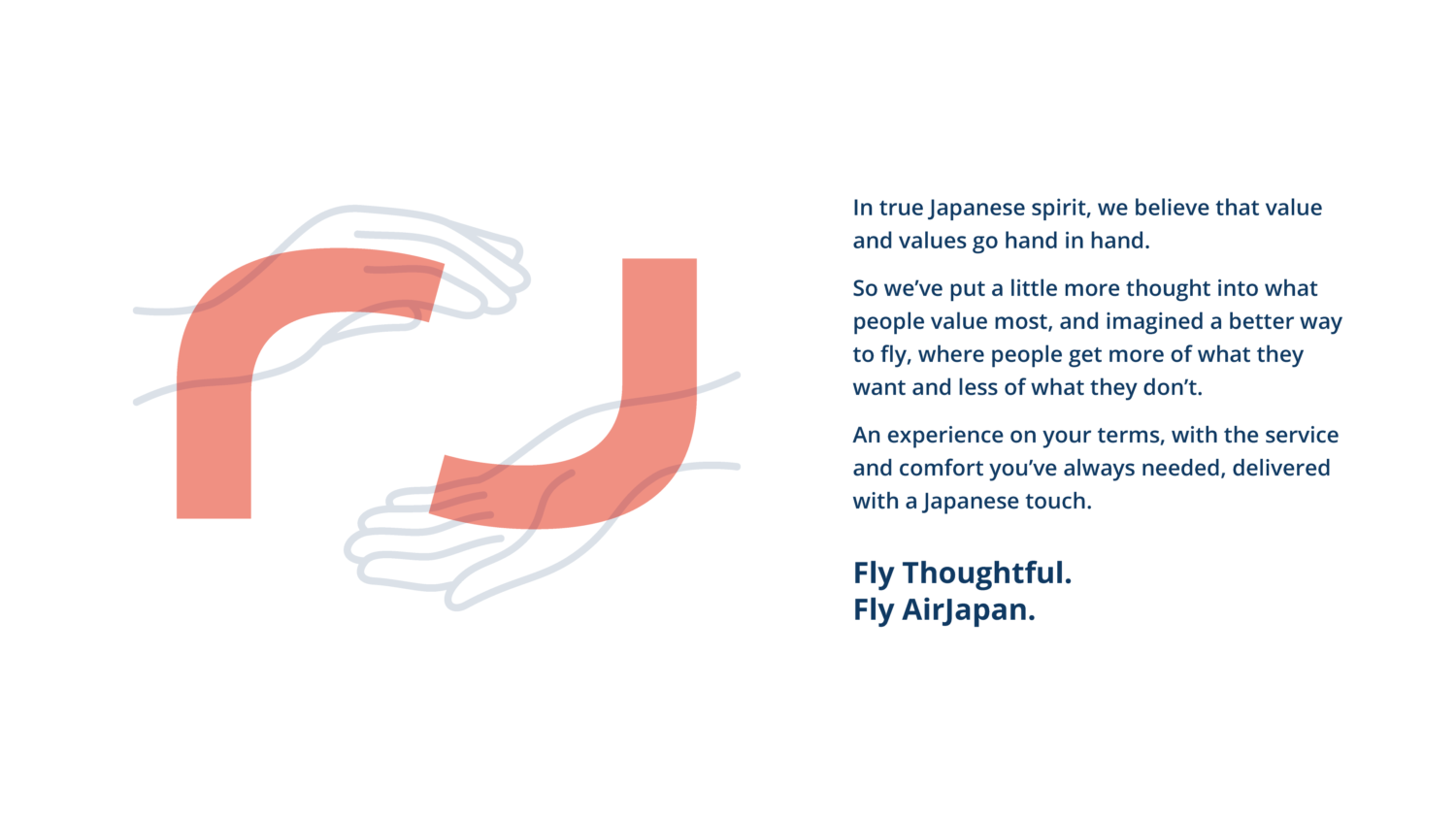 品牌标志由“Air Japan”字样组成。字母“r”和“j”以鲜红色突出显示,并在做出?;?握住手势时以类似于人手的方式构造。这种作为视觉隐喻的字母组合在视觉标记的意义上也作为品牌形象的一部分独立出现,例如在机器的垂直稳定器上,在靛蓝上以浅红色显示背景。该公司解释了手的比喻:“本着真正的日本精神,我们相信价值和价值观齐头并进”。