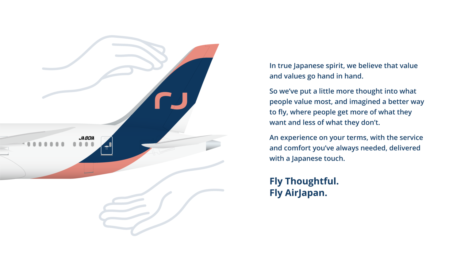 日本航空的战略定位介于低成本航空公司 Peach 和高端航空公司全日空航空公司之间,这两家航空公司都是 ANA Holdings 的子公司。因此,在定位方面,既注重价格,又注重服务和舒适。几天前推出了新的品牌标识。全日空相信,旨在服务于国际中程航线的新航空公司品牌将创造一种全新的航空旅行方式。