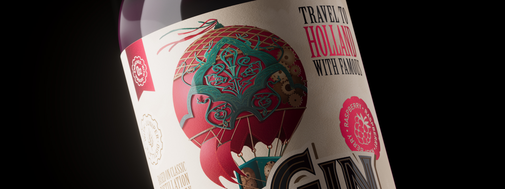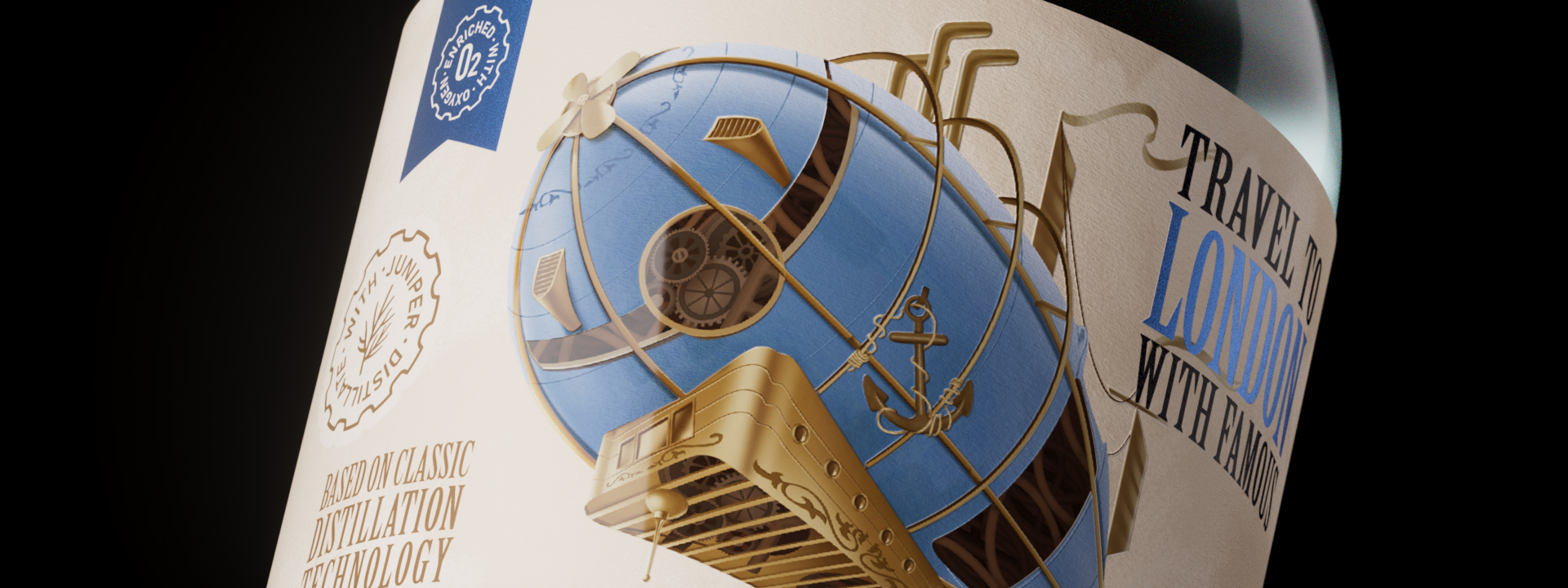 设计理念建立在维多利亚时代的蒸汽朋克美学之上,这使我们能够将最英式的饮料联系在一起,建立一个清晰的系统来区分不同的SKU,并强调乘坐飞艇旅行的想法。为什么是飞艇和气球?这是一种相当典型的蒸汽朋克运输方式,主要的视觉标志是一个充满空气的巨大圆顶,它强调了这个名字,并再次告诉我们饮料的轻盈。除了飞往伦敦的航班上的经典杜松子酒外,您还可以向东行驶,品尝柚子杜松子酒或招牌粉色覆盆子杜松子酒,气球轻轻地漂浮在日落中。