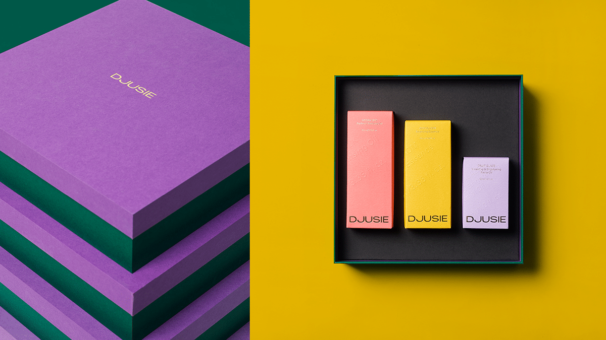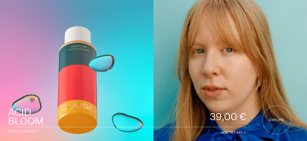 然而,强烈、封闭的颜色还有另一个含义:Djusie 故意将自己定位为适合所有人的中性护肤品。这也反映在包装镜头背景中发光的彩虹渐变以及Djusie网页设计和社交媒体中多样化的演员阵容中。