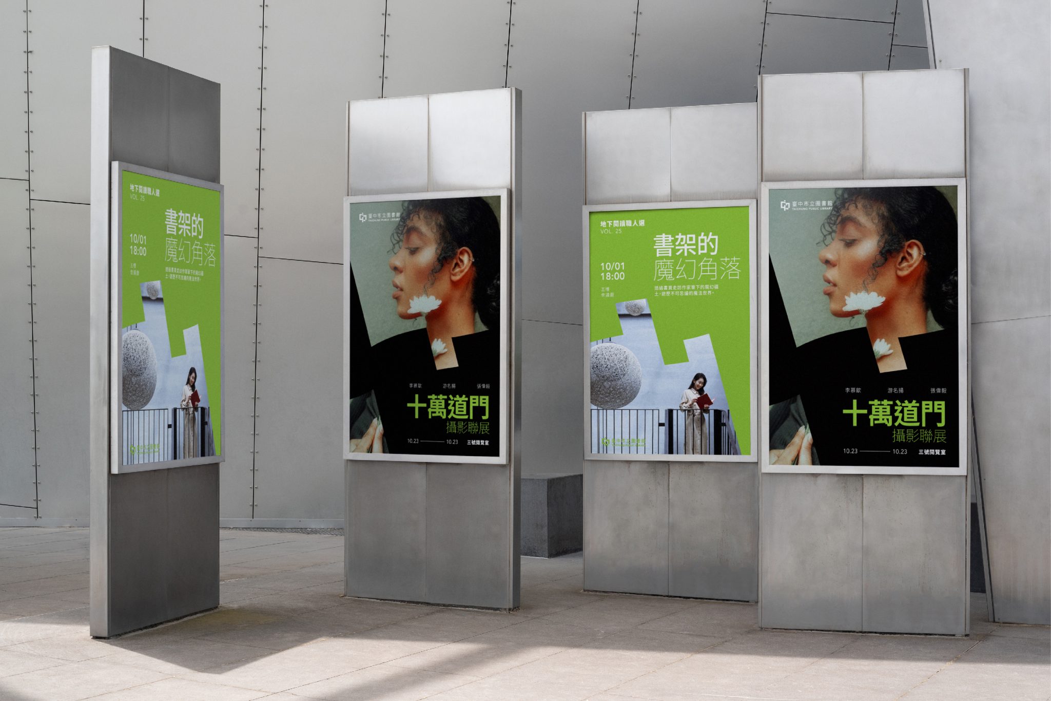 帮助图书馆根据核心概念制定了视觉策略。标志的灵感来自书籍、台中的“中”字和图书馆大楼??樽赐夹斡糜诶┱故榧妥址爸小钡淖楹?,这与建筑物的方形设计相匹配。波浪形的边缘使徽标灵活,就像跳入书海并享受获取知识的乐趣。我使用绿色作为原色。黑色街区位于公园的北侧,图书馆所在的位置。