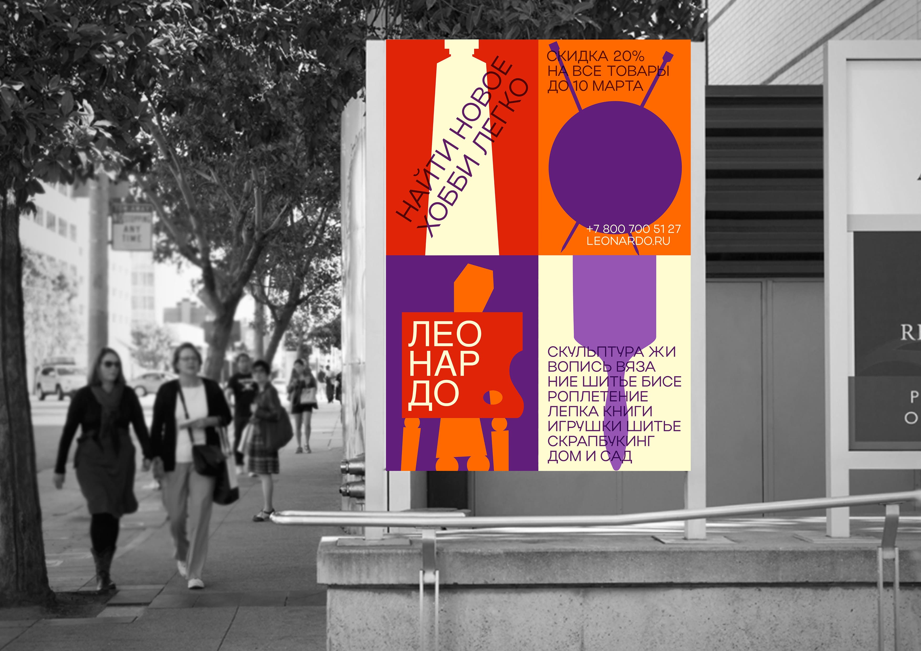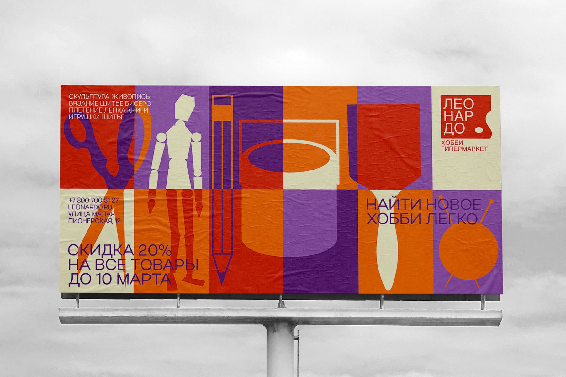 新设计的主要元素是代表不同创意爱好的矢量插图,无论是绘画、刺绣、编织、书法、折纸等。每个项目都有“自己的位置”,并故意放在矩形内。这种视觉解决方案完美地说明了艺术家手提箱的结构,它可以包含来自不同创意领域的许多物品,这些物品可以很容易地移动和重新组织。调色板的选择方式也象征着莱昂纳多商店的艺术性质。