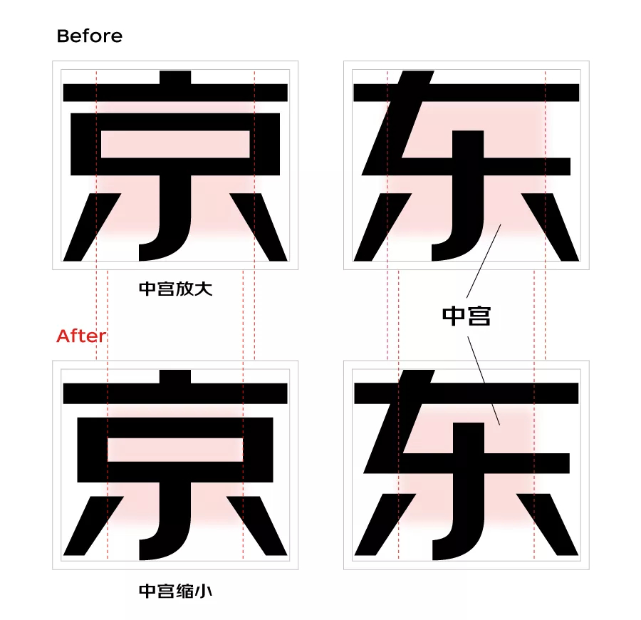 以“京东”二字为例,首先,我们对横竖比例进行了调整。原来的“京东”二字,横比较细竖比较粗,为了强化力量感的传达,设计师反复思考、不断尝试,最后将字体横竖比例定为了2:3。横竖比例的改变,让整个字的灰度变得稳定、均匀,也显得更稳重、更有力量感。