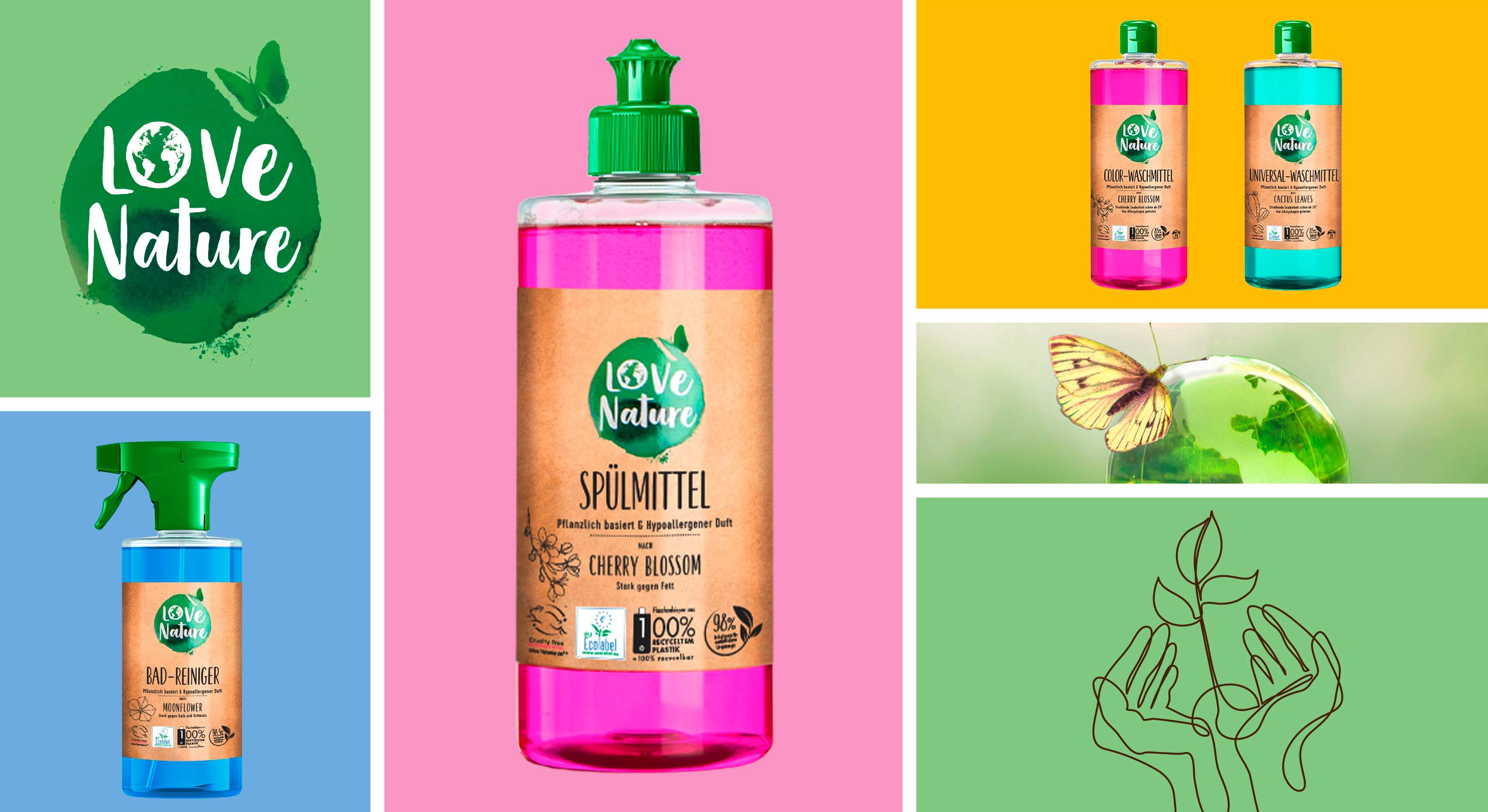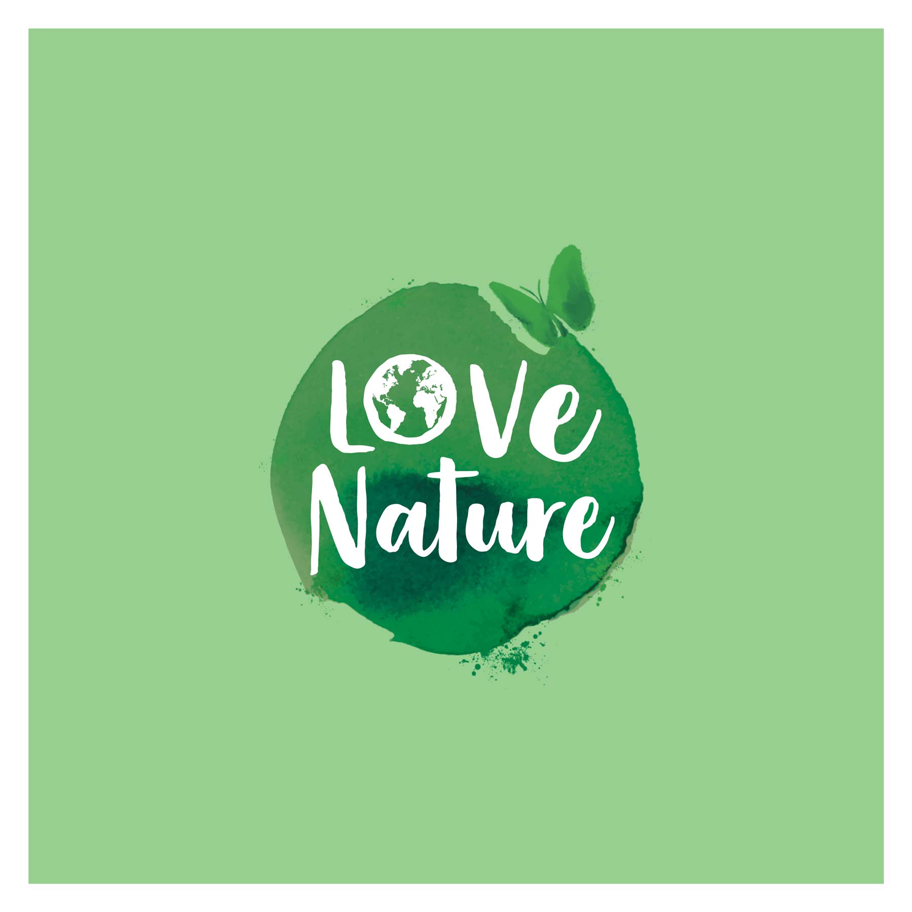 品牌标志设计清楚地揭示了涉及可持续性的。带有艺术水彩风格的自然绿色象征着大地,并与自然标签颜色形成鲜明对比。此外,这个形象在“爱”这个词的字母“o”中更加清晰。最上面,一只蝴蝶正在张开翅膀飞向大自然。情感元素让你感觉良好,有意识地生活并创造一个运动。正如汉高的产品经理所说: