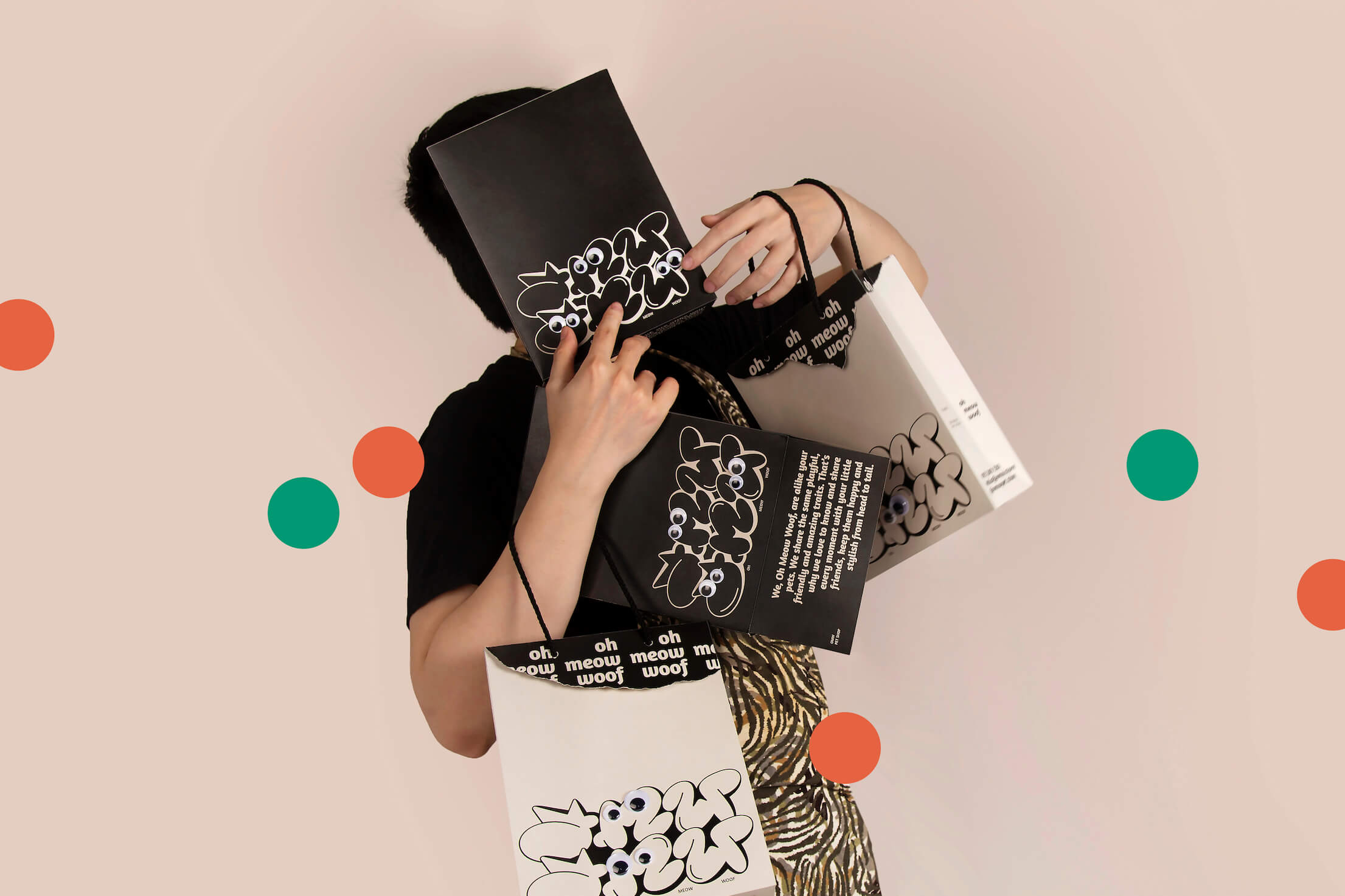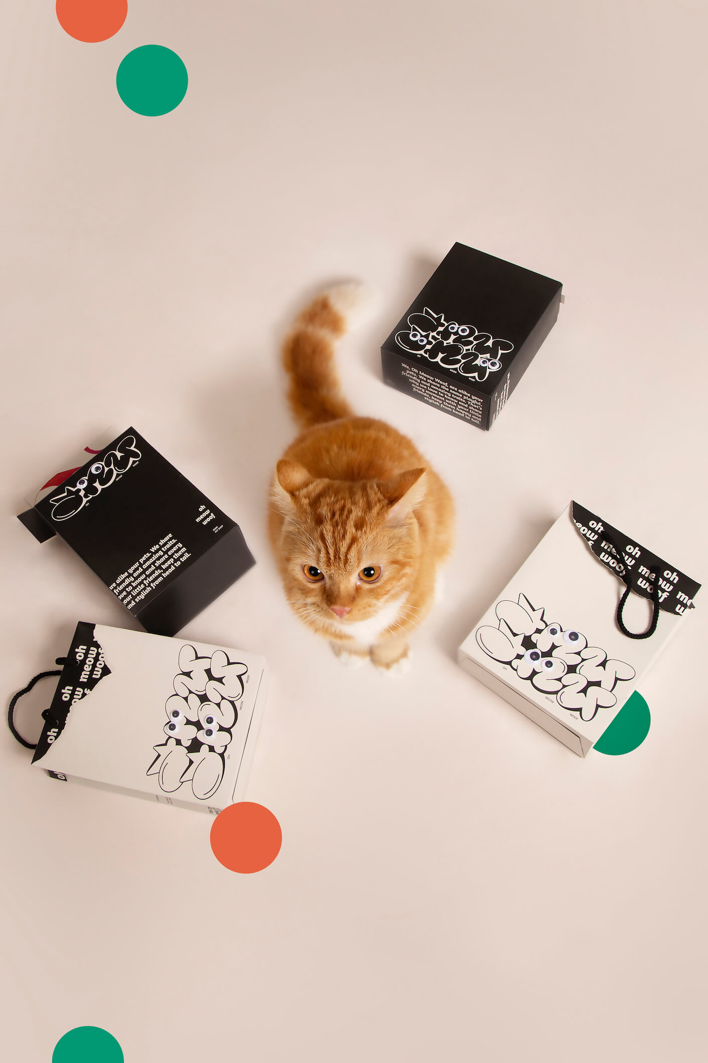 与上述图形处理相结合,色彩缤纷的狗/猫插图描绘了我们四足朋友的日常生活和秘密故事。这些图画无处不在,等待着从穿孔盒子、折叠小册子甚至购物袋的隐藏角落中给您带来惊喜。你准备好找到他们了吗?立即查看 OMW 产品。