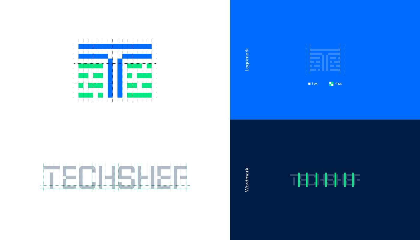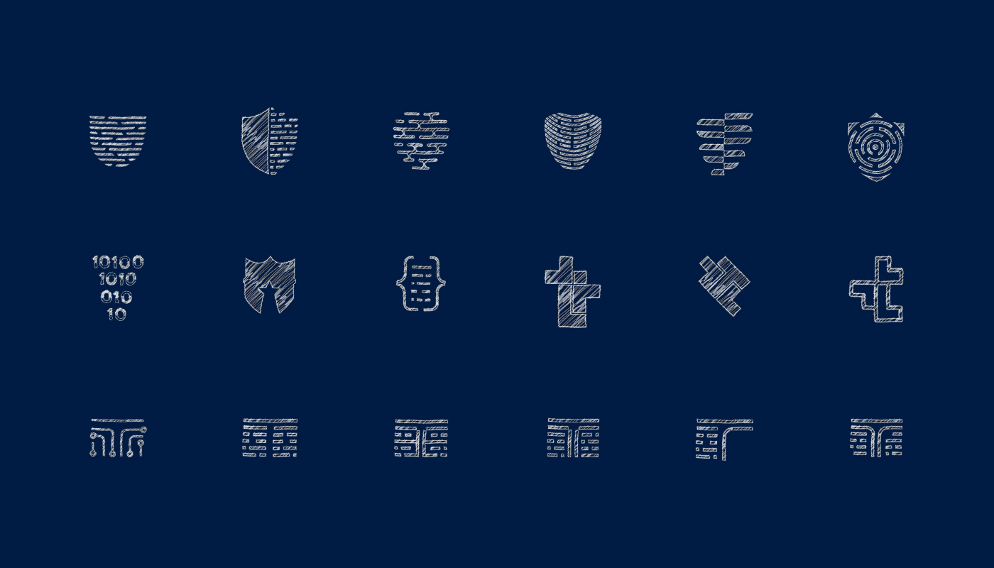 到了制作logo的阶段,我们在实现之前打下了基础,就是标准尺寸为1像素的网格,然后我们开始绘制logo,并确定线之间的距离,直到我们得到需要的形状,我们以符合先进技术的现代方式展示字母 (T),并将其与安全防护元件集成在一起,形成一道防御墙并确保产品安全。