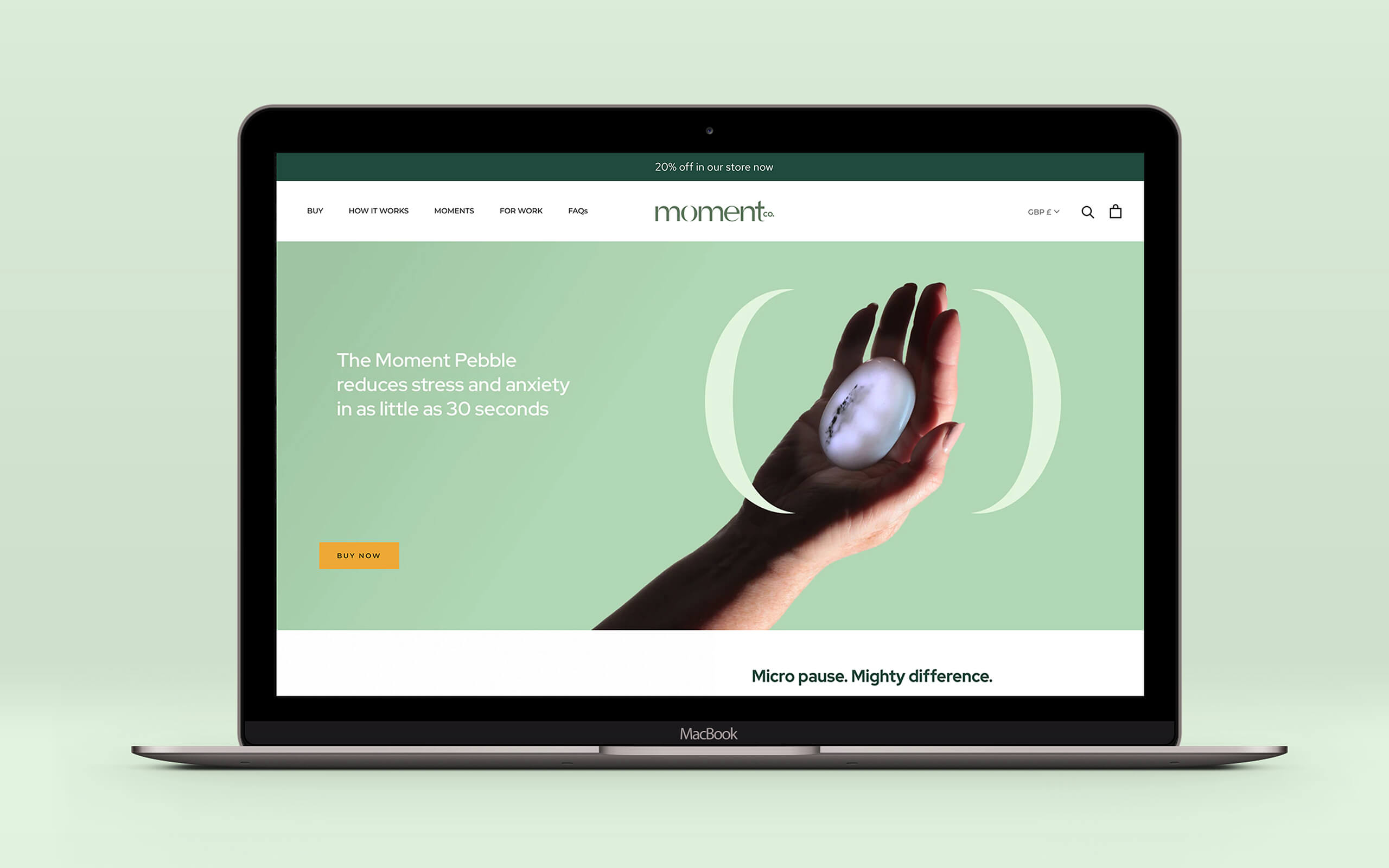 通过解决全球面临的日益严重的心理健康问题,Moment 公司创造了一种独特的心理健康解决方案,将正念时刻融入日常生活,减轻压力、焦虑和抑郁。Moment Pebble 可帮助您在一天中进行短暂的正念微停顿。这种天然石装置与技术无关,通常是我们压力的来源,它使用温和的光脉冲来引导您完成强大的减压呼吸练习。在短短 30 秒内,Moment Pebble 可帮助您重置身心,并让您的神经系统平静下来。这与自定进度的 Moment 程序相结合,让您沉浸在一系列技术中,包括正念、呼吸和冥想。Moment Company 希望站在全球健康经济讨论的前沿,