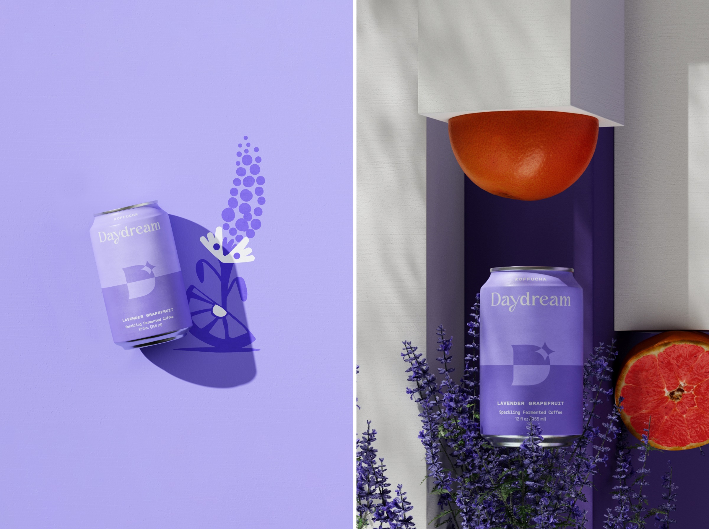 该解决方案集中在一个大同型上,它可以在货架上和社交媒体上轻松快速地被识别。颜色同时被分割和混合,在一种视觉上的阴阳中:能量+健康,咖啡+康普茶,工作+个人生活。