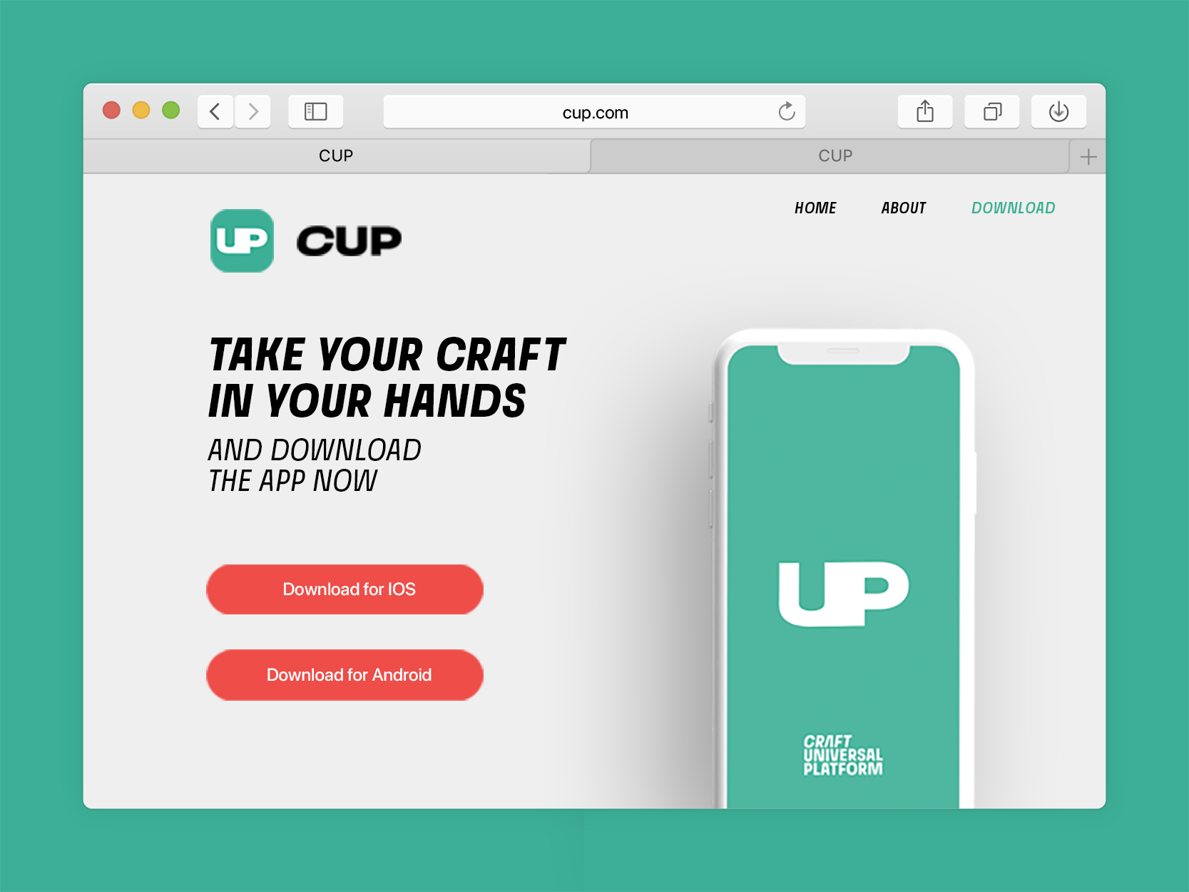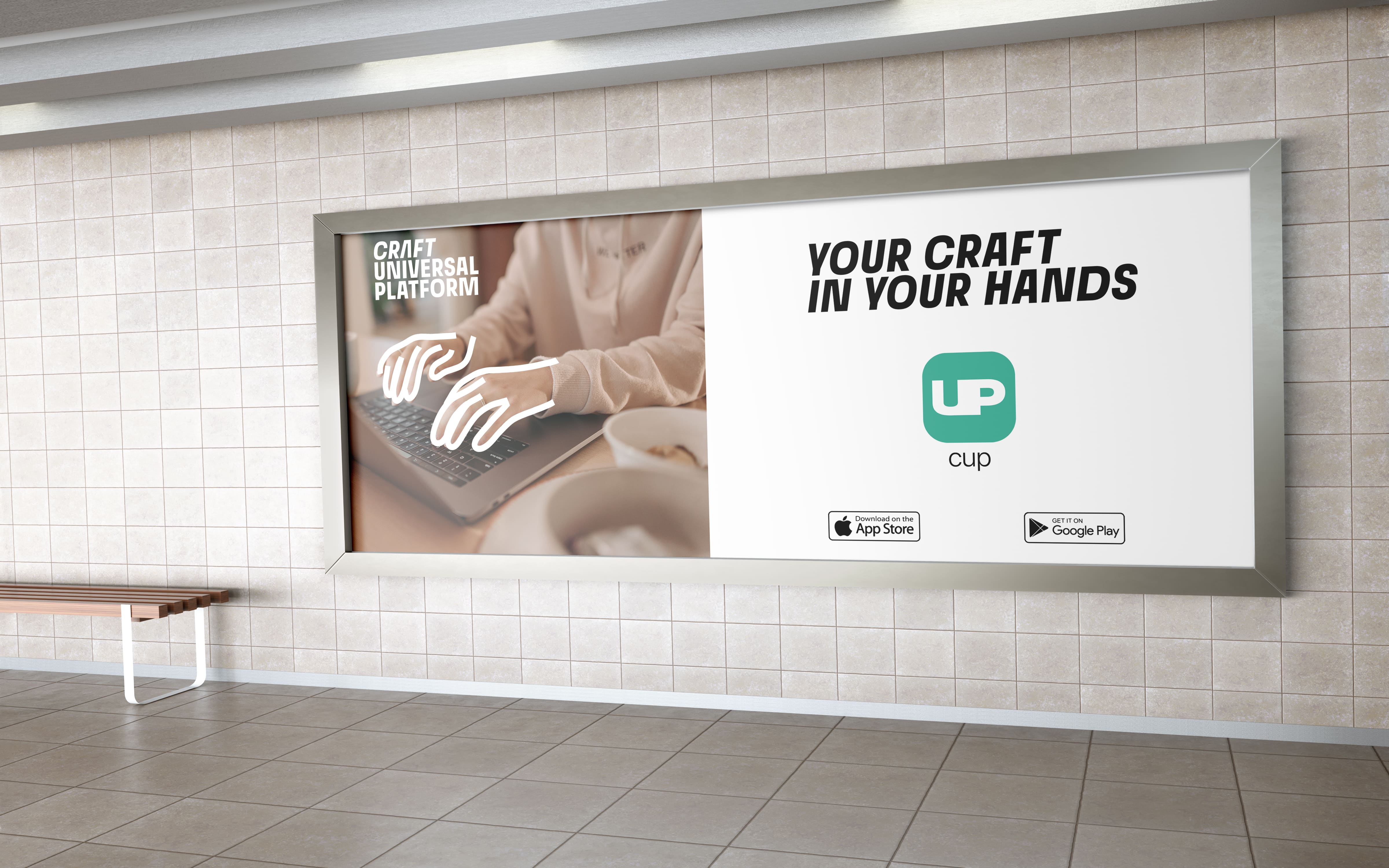 公司徽标本身包括突出显示的字符“向上”,意思是顶部。反过来,如果没有这个关键含义,“商业”的概念是不可能的。当客户端与程序交互时,这就是等待被填满的杯子。首字母缩略词本身包含“手工艺”、“工匠”的概念——用双手创造和培育企业的人。双手成为与人交流的主要手段,工匠们需要这个应用程序来刺激他们的业务增长。