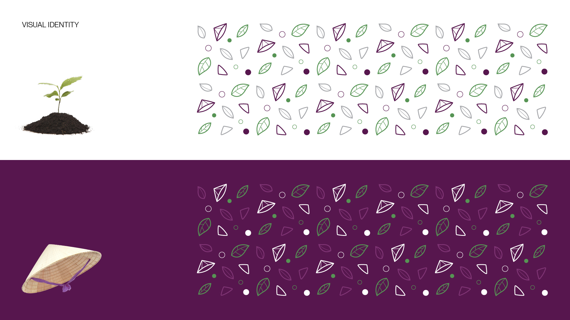标志设计选择上,我们以现代标准下的新鲜和简约为品牌个性。通过结合负空间形状和线条艺术来展示多样性和快乐的心情,我们设计了一个标识,每个单词中都包含两个符号。紫色调色板的灵感来自 Phuong Anh 的标志性水果之一——茄子,被选中来营造一种兴奋和不同的感觉。这个调色板充满活力和不寻常,最能突出市场上的品牌。最重要的是,Avenir 字体家族支持带来友好的美学和良好的可读性。此外,“non la”和树叶的关键视觉以轮廓样式生成,并作为一种模式发挥作用,这为结果增加了更多的灵活性和快乐性。
