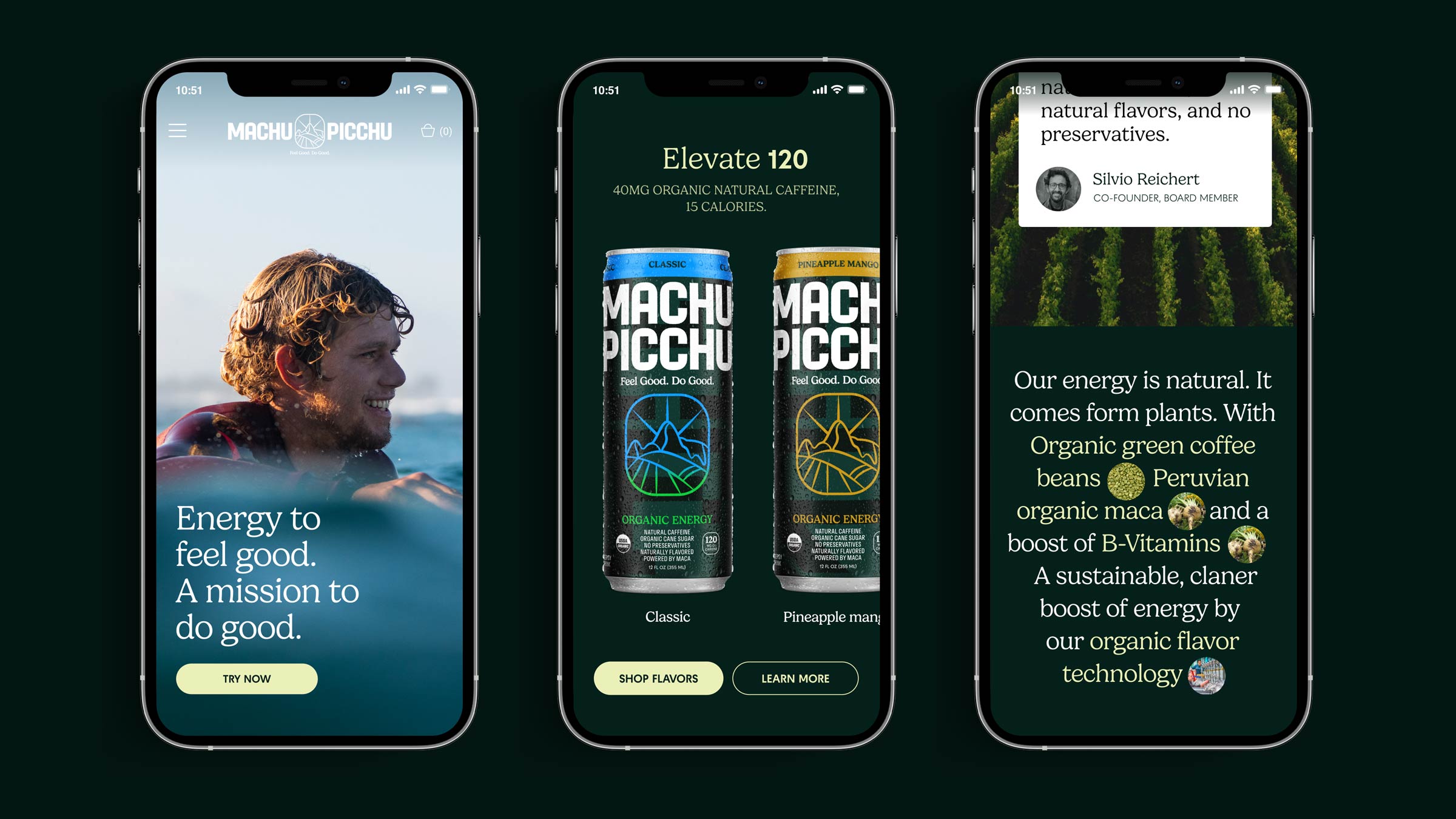 基于这一品牌战略和使命,Firma 随后开发了 Machu Picchu Energy 的“Feel Good”。做得好?!?nbsp;标语并通过图像、包装、网站设计和开发等创建了完整的品牌标识。视觉语言借鉴了许多自然的影响,丰富的深绿色、鲜艳的色彩、印加风格的图案和排版共同作用,成为过去和现在之间的桥梁。设计元素,从有质感的品牌图标到中心插图,帮助将美丽的马丘比丘山带到每个人的手掌中。
