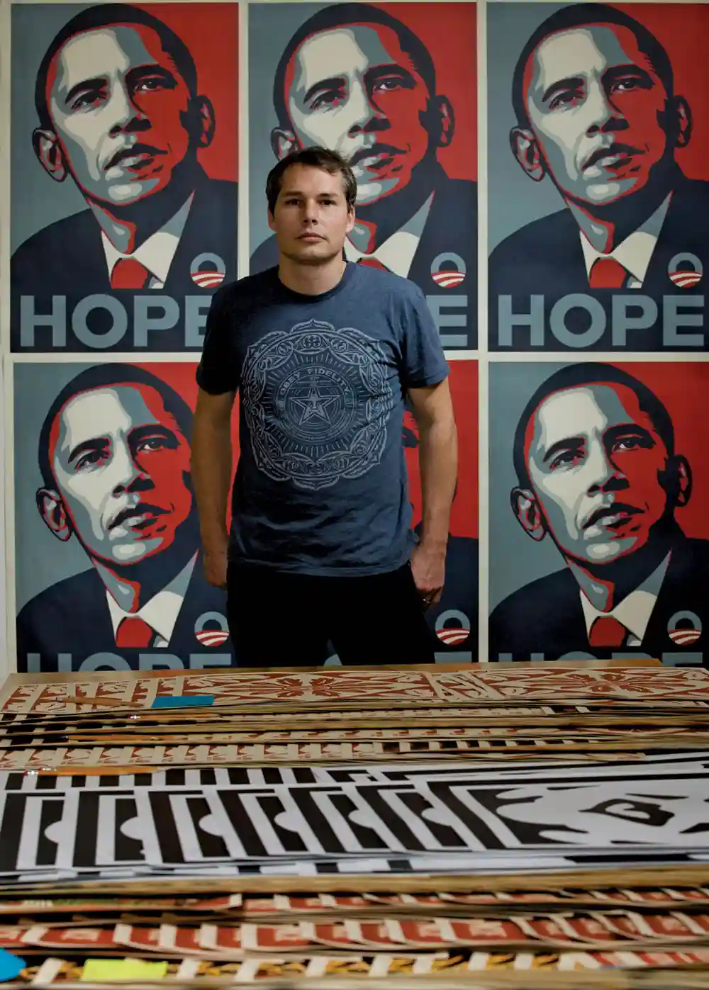 顺便说说这位艺术家,他在2008年为美国第一位黑人总统奥巴马绘制「HOPE」竞选海报而成名。由于他在创作之初选用的肖像图片来自美联社,因此在后来还惹上了版权官司。最终,海报作者 Fairey 因在案件审理过程中谎报图片来源被判缓刑,???.5万美元。