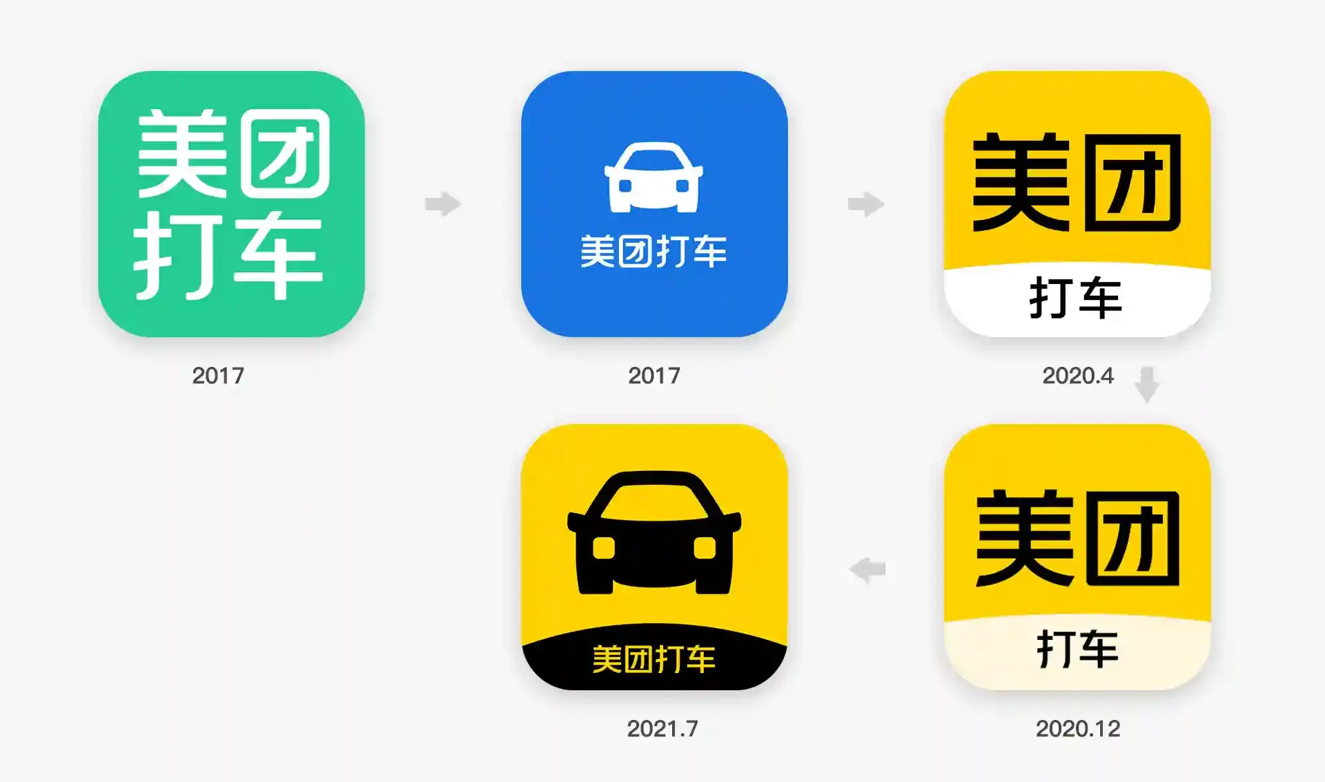 美团打车在拥有独立 App 期间使用的图标是蓝底白色图标,2019年并入美团 App后,图标变成了美团的图标,并在下方标有「打车」字样。