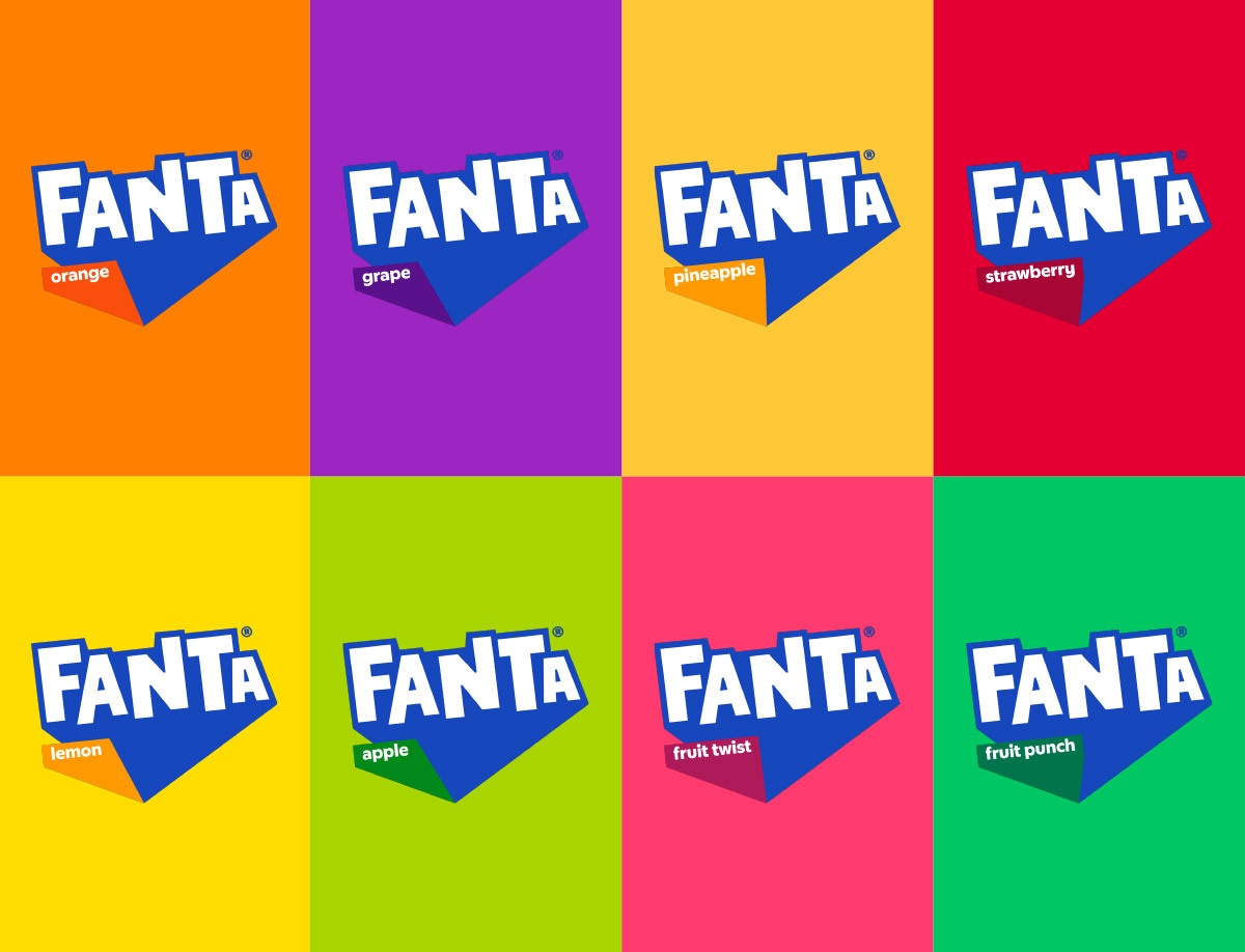 更让人赞口不绝的是,芬达对产品颜色的提炼和应用。如果说上述主色调是芬达FANTA品牌的色彩传播中心,那么产品配色则为品牌提供了更有效的消息传递。产品风味颜色调色板提取自每种水果最有识别度的颜色,是用于传递特定的口味最佳的解决方案。