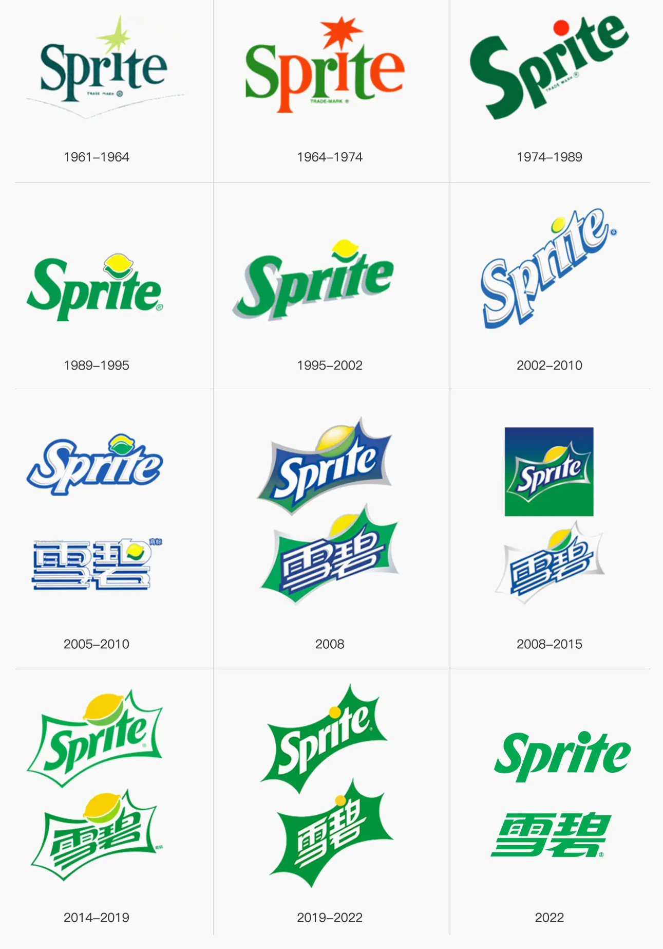 雪碧的品牌历史演进堪称漫长复杂。1961年,星爆图案首次出现在LOGO中。直到1989年,星爆被换成了简约柠檬标志,随后十余年,柠檬标志仍是雪碧最具代表性的标识之一。而到了2008年,星爆及字标融为一体,推出了全新的LOGO。经过数次演进,星斗最终简化为纯粹的点型,柠檬图标逐渐消失。