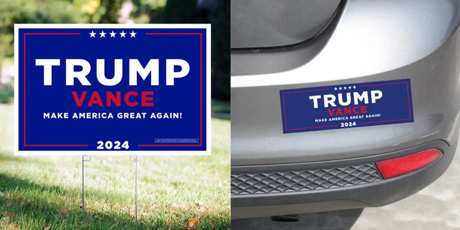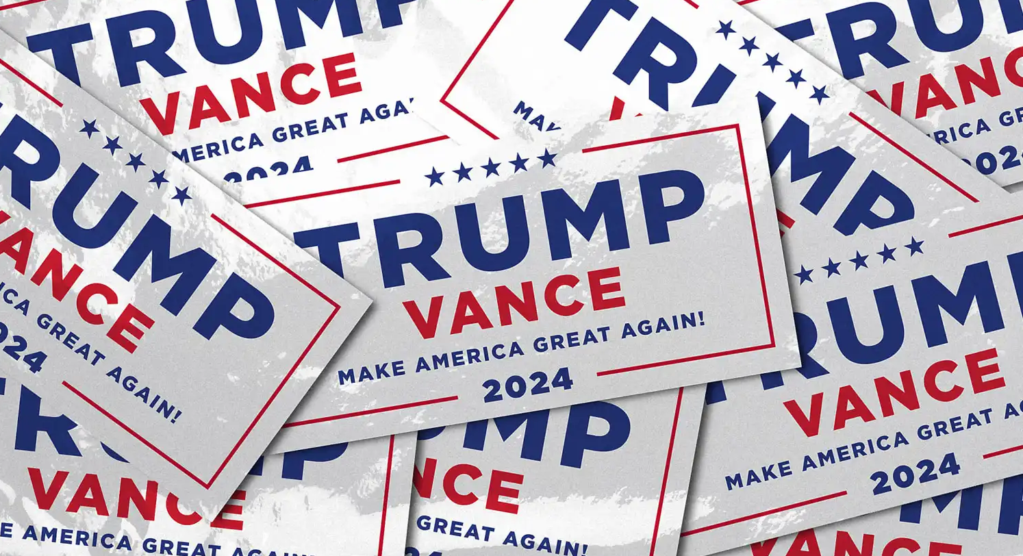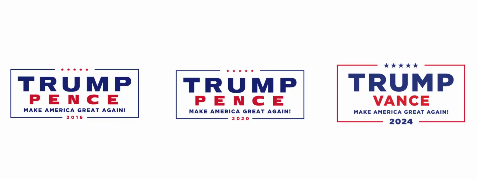 实际来看,新设计的竞选标志在核心设计元素上与前版保持一致,仅对细节进行了轻微优化。2024年的竞选标志只是将年份更新为「2024」,并把上一届的竞选搭档名字「Pence(彭斯)」中的「P」和「E」换成了「V」和「A」,以拼出新竞选搭档Vance(万斯)的名字。