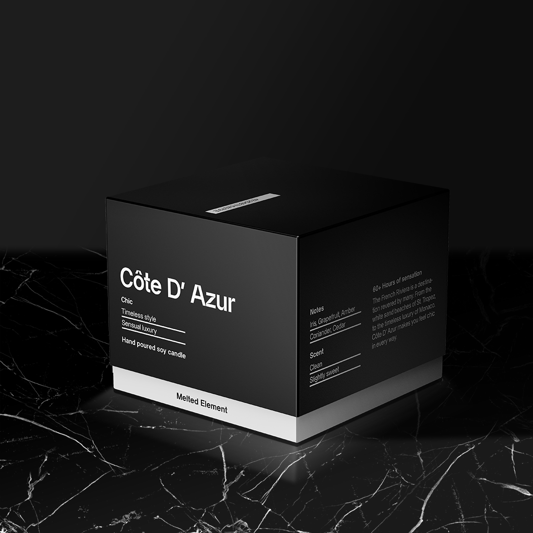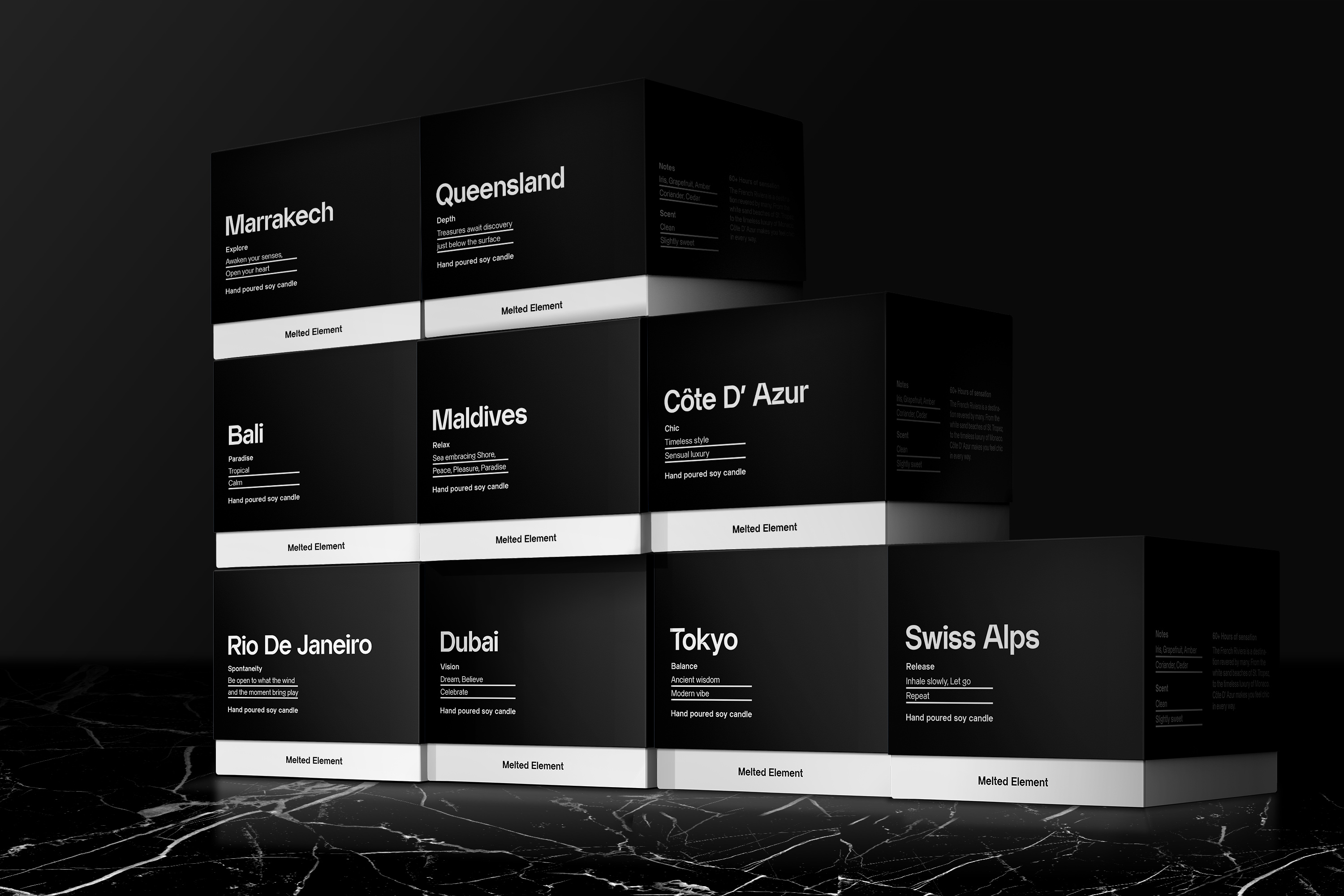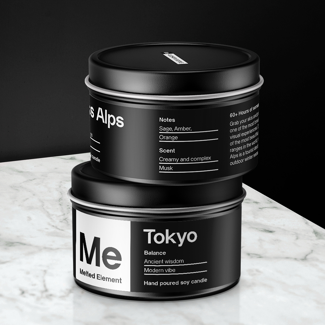 Melted Element 是一家位于美国的优质精品蜡烛生产商。虽然他们的产品由 100% 天然大豆蜡制成并手工制作,但他们的香味灵感来自世界各地的不同地方。他们一共有九种香味,每一种都有不同的城市名称,如东京、巴厘岛、迪拜、马拉喀什等。他们所有的香味都有两种不同的尺寸;6 盎司和 11 盎司。他们的 6 盎司蜡烛倒入铝罐中并被称为“旅行尺寸”,而他们的 11 盎司蜡烛则倒入优质玻璃罐中,有两种颜色可供选择:黑色和白色。