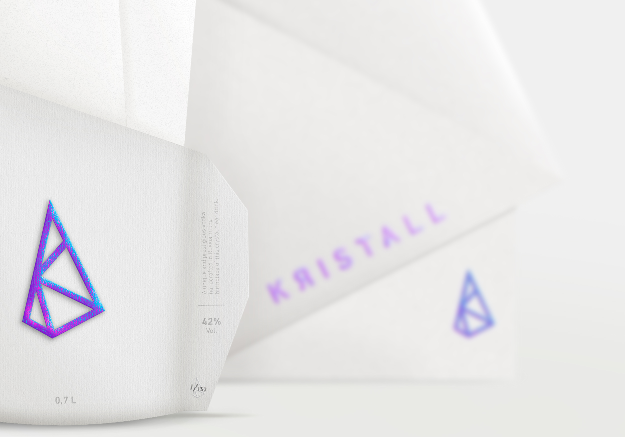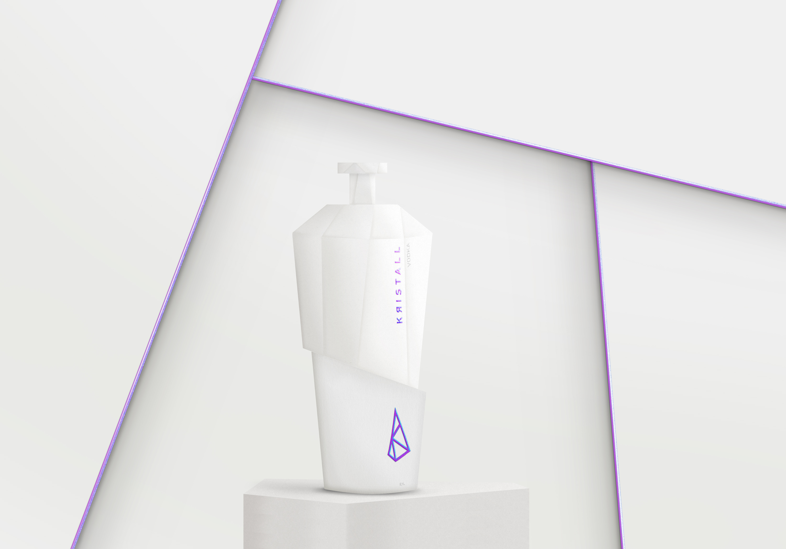 产品包装设计的灵感。通过命名这个品牌 Kristall,我想将两个非常相似的实体结合在一起。水晶:纯净、纯洁、珍贵、尊贵。和 Kristall 伏特加,它占据了这些相同的方面。通过象征水晶的象形图的尖锐形状可以感受到它们。线条的锐利为我们注入了品牌的珍贵和声望。Kristall 的每个字母都刻在徽标内,以在象形图和品牌历史之间建立联系。为了增加水晶中的那种光彩,我用彩虹色给标识着色。紫色、粉红色和蓝色渐变之间的这种变化给产品带来了罕见的印象。水晶伏特加,顾名思义,就像水晶一样珍贵稀有。