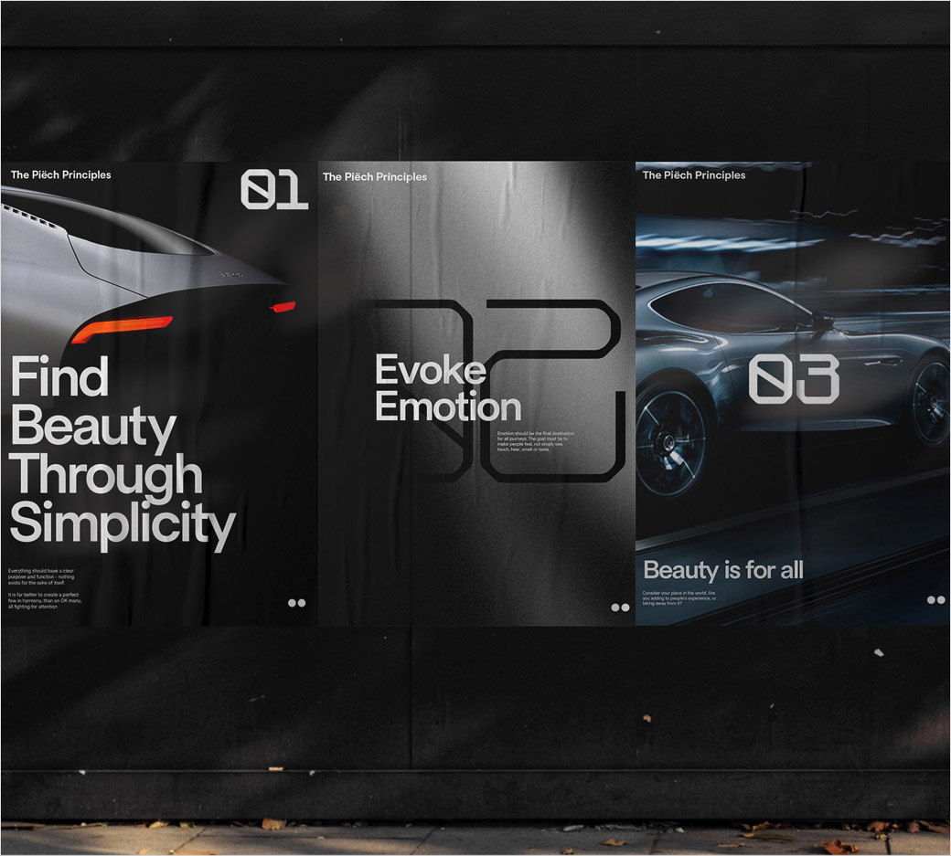 定制版式和更广泛的 Pi?ch 视觉识别是与瑞士字体设计师 Robin Eberwein 和跑车公司内部设计团队 Pi?ch Design Lab 合作开发的。