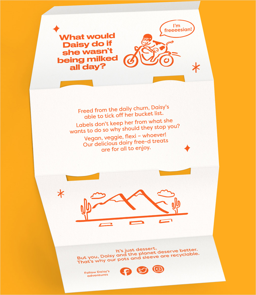 包装上的身份由 Robot Food 初级设计师 Ryley Devine 在内部说明,从产品到产品的变化,描绘奶牛黛西“从她的遗愿清单上打勾”。
